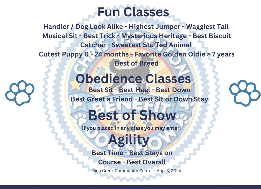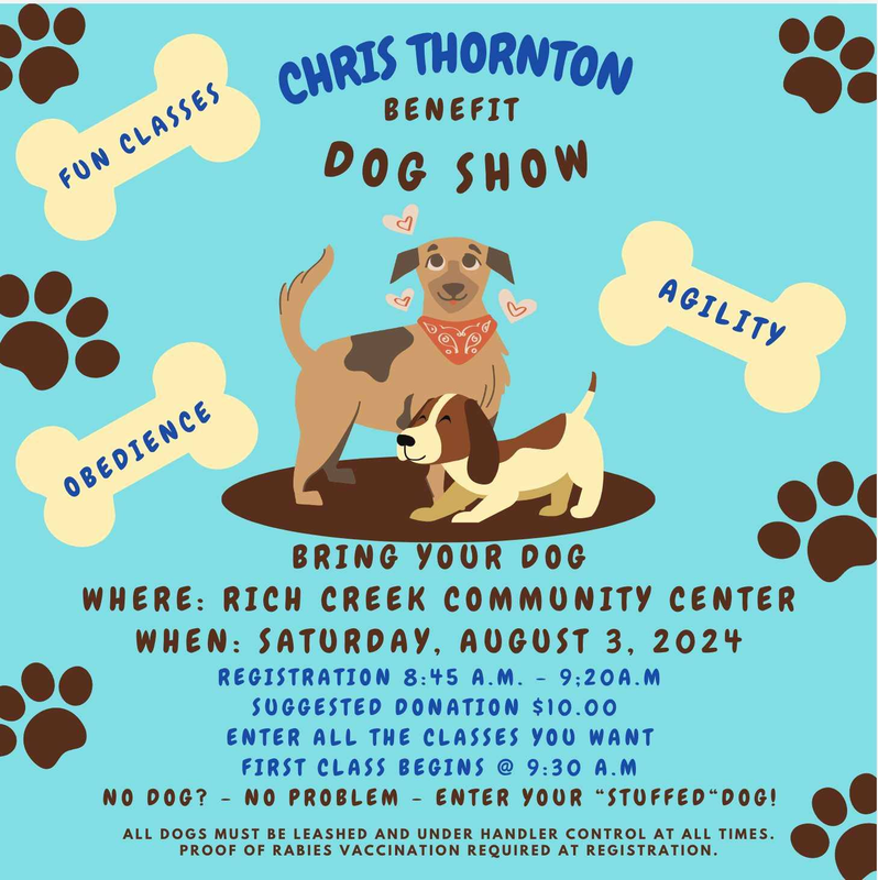 The Chris Thornton Benefit Dog Show is a suggested donation of $10.00 per dog and dogs can enter all the classes you want.