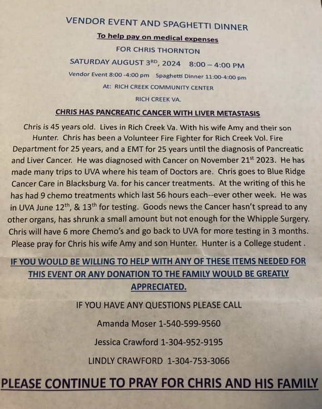A Spaghetti Dinner and Vendor Event will be held for Local Firefighter Chris Thornton on Saturday, August 3, 2024 at the Rich Creek Community Center in Giles County, VA.