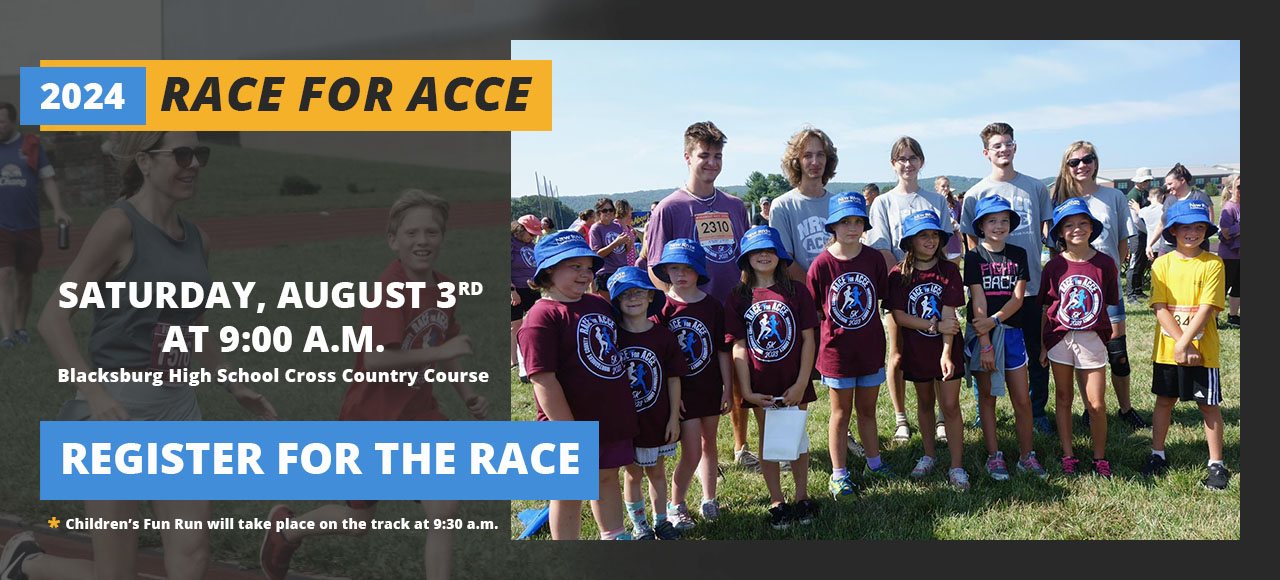 The Montgomery County ACCE (Access to Community Education) program presents the 6th Annual Race for ACCE 5k and Kids Fun Run on Saturday, August 3, 2024 at Blacksburg High School's Cross Country Track.