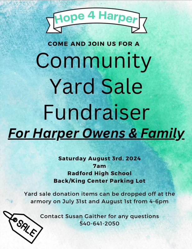 The Hope 4 Harper Community Yard Sale Fundraiser for Harper Owens & Family will be held on Saturday, August 3, 2024 at Radford High School in the back / King Center parking lot.