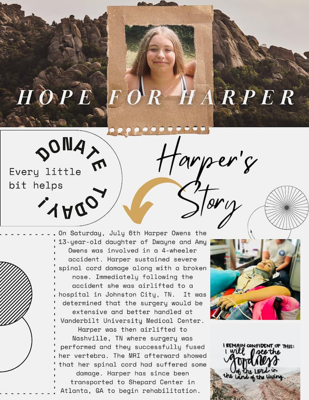 Harper Owens, the 13 year old daughter of Dwayne and Amy Owens, was involved in a 4-wheeler accident. Harper sustained severe spinal cord damage along with a broken nose. Immediately following the accident she was airlifted to a hospital in Johnson City, Tennessee and then transferred via airlift to Vanderbilt University Medical Center in Nashville, Tennessee and has since been transported to Atlanta, Georgia to begin rehabilitation.