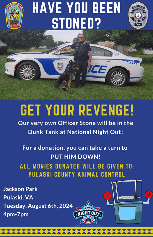 The Pulaski Police Department's very own Officer Stone, who's written a lot of speeding tickets over the years, will be in the dunk tank at National Night Out. All are welcome to get their revenge for a donation to try and dunk Officer Stone. All money will be donated to the Pulaski County Animal Control.