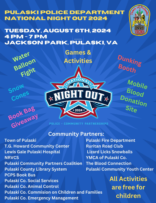 The Pulaski Police Department and the Town of Pulaski presents National Night Out with Pulaski Police Department on Tuesday, August 6, 2024 at Jackson Park.