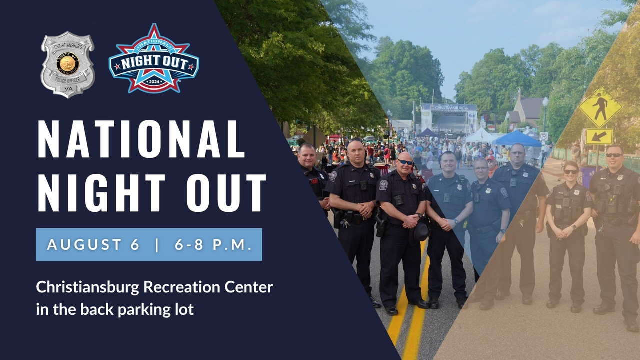 The Christiansburg Police Department presents National Night Out on Tuesday, August 6, 2024 in the back parking lot of the Christiansburg Recreation Center.