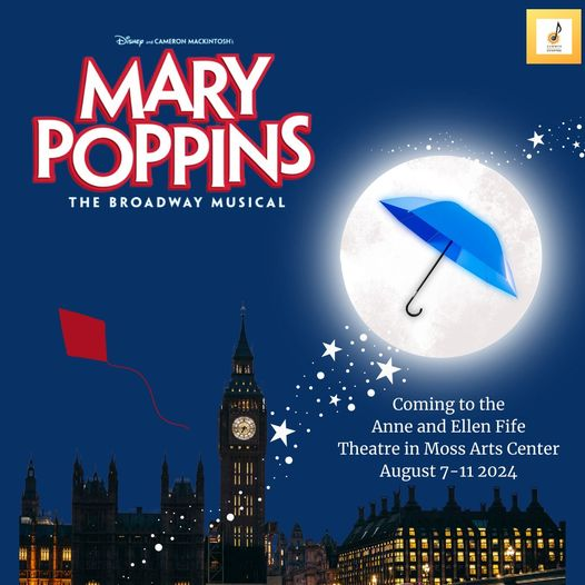 Summer Musical Enterprise presents "Mary Poppins the Broadway Musical" with six performances at the Moss Arts Center starting on Wednesday, August 7, 2024 and continuing through Sunday, August 11, 2024.