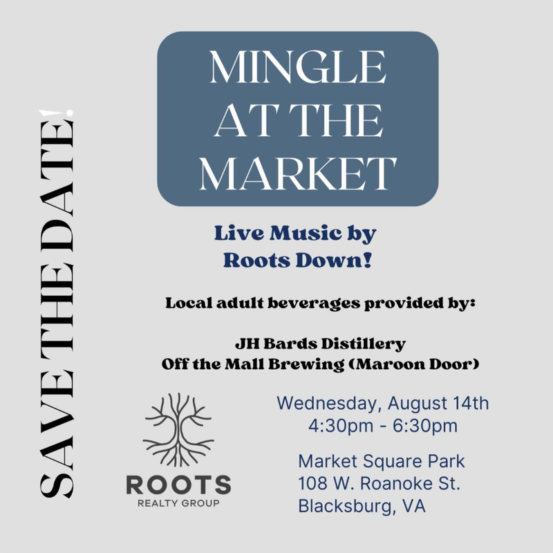 The Blacksburg Farmers Market presents the August Mingle at the Market with music from Root Down on Wednesday, August 14, 2024 at Market Square Park.