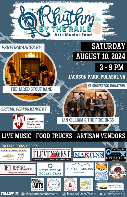 The Fine Arts Center for the New River Valley presents the 2024 Rhythm by the Rails on Saturday, August 10, 2024 at Jackson Park in Pulaski, VA.