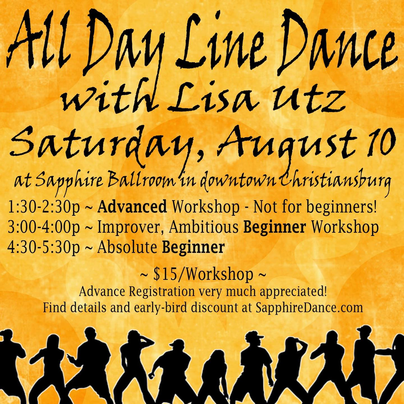 Sapphire Ballroom & Dance Center presents All Day Line Dance with Lisa Utz on Saturday, August 10, 2024.