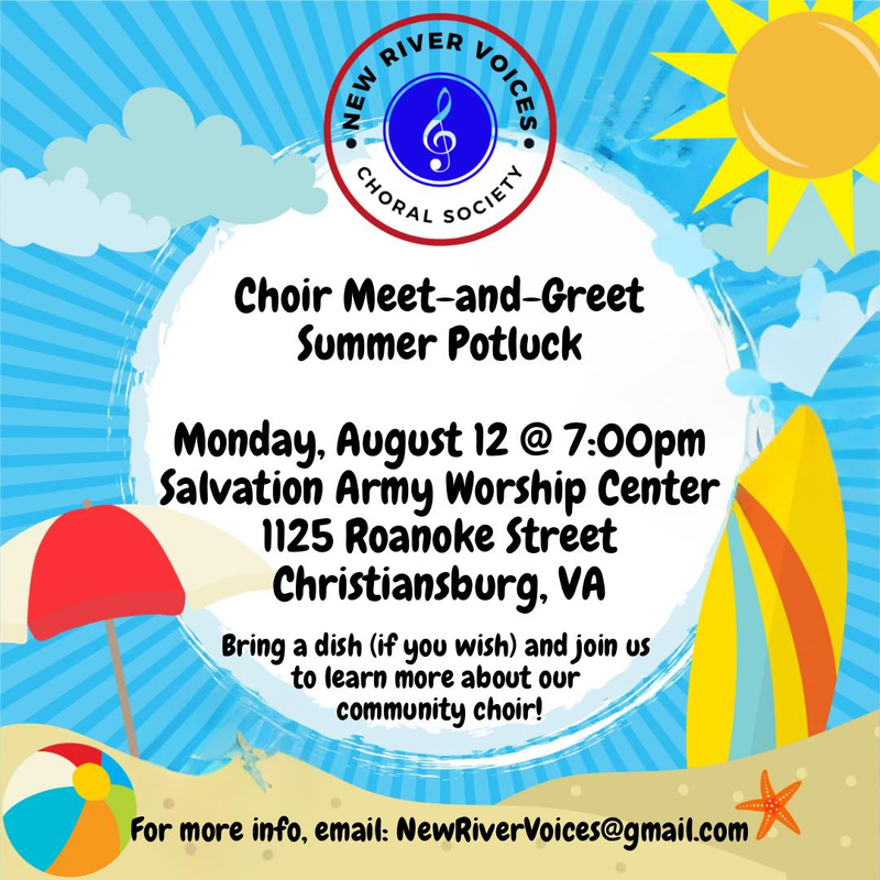 New River Voices Choral Society presents a Choir Meet-and-Greet Summer Potluck on Monday, August 12, 2024 at the Salvation Army Worship Center in Christiansburg, VA.