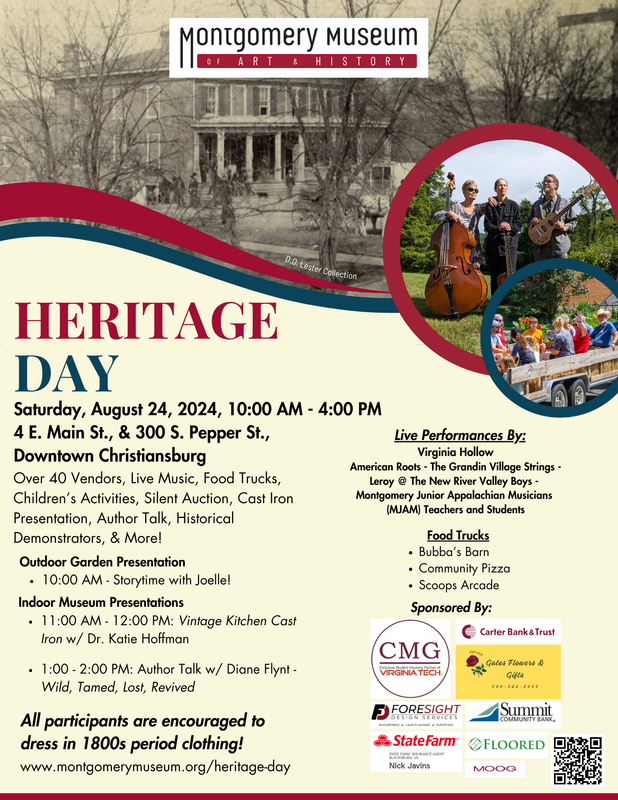 The Montgomery Museum of Art and History hosts its annual Heritage Day on Saturday, August 24, 2024 at the Montgomery Museum of Art and History (4 East Main Street), at the Montgomery Museum Garden (300 Pepper Street) and along 4 East Main Street in downtown Christiansburg, VA.