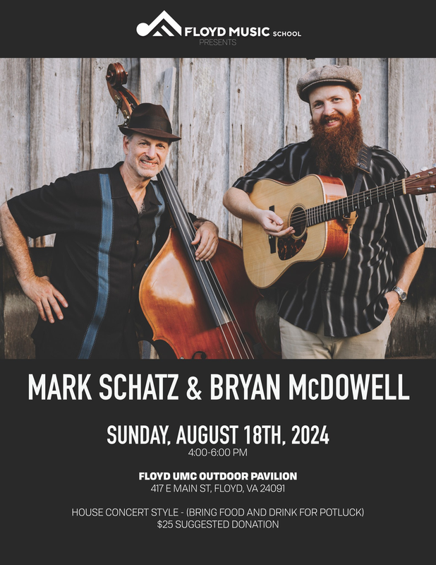 The Floyd Music School presents the duo Mark Schatz and Bryan McDowell in a house-style concert on Sunday, August 18, 2024 at the Floyd United Methodist Church Outdoor Pavilion.