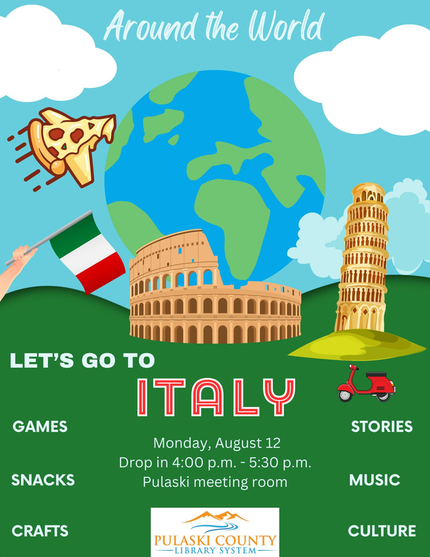 Join us for a trip to Italy without leaving Pulaski County. We will make crafts, try new foods, listen to music and learn all about Italian culture.