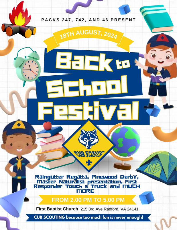 Cub Scout Packs 247, 742 and 46 presents a Back to School Cub Scouts Party on Sunday, August 18, 2024 at First Baptist Church in Radford, VA.