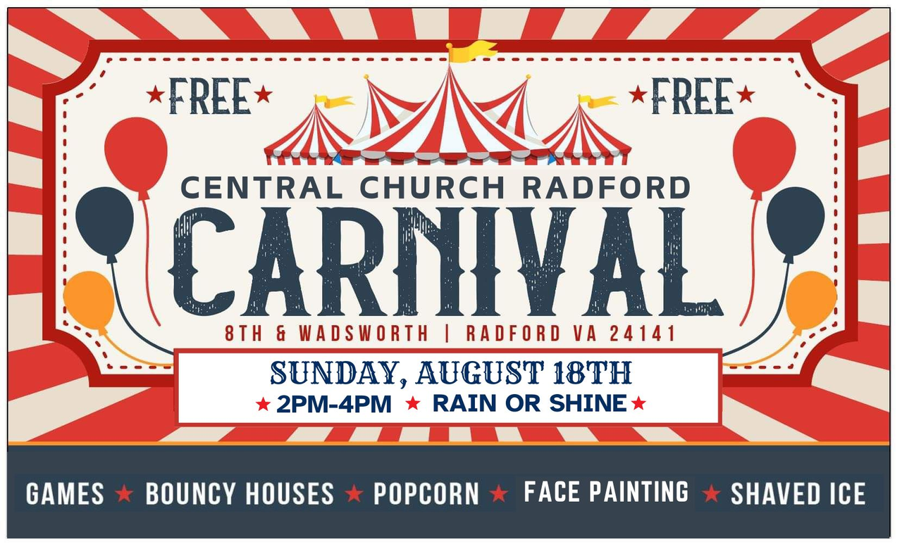 Central Church Radford presents their Annual Free Carnival on Sunday, August 18, 2024.
