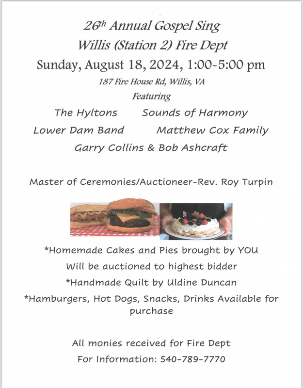 The Floyd County Volunteer Fire Department Station #2 presents the 26th Annual Gospel Singing Fundraiser on Sunday, August 18, 2024.