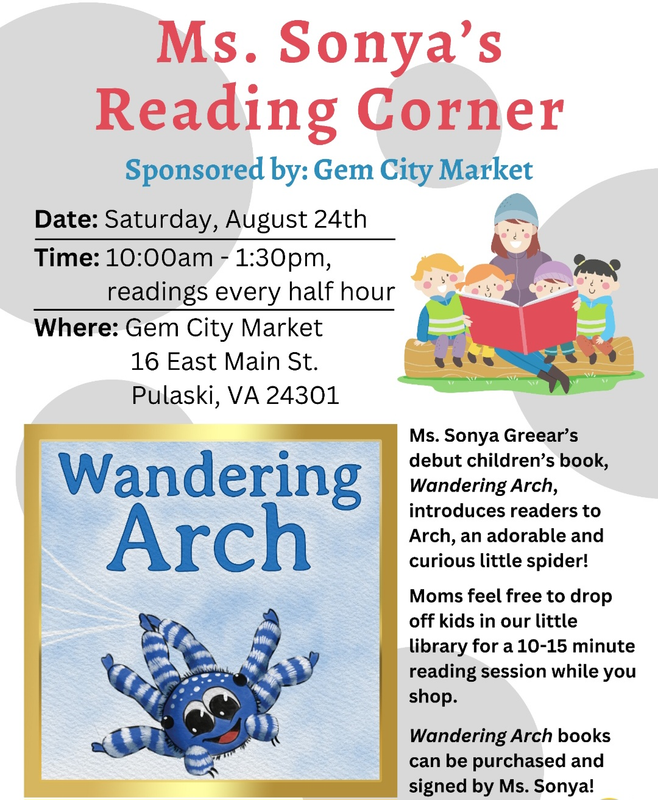 Join us for a book reading and signing by Ms. Sonya with her debut book "Wandering Arch". "Wandering Arch" introduces readers to Arch, an adorable and curious little spider. Starting at 10:00 AM, book readings will happen every half hour while the boutique is open.