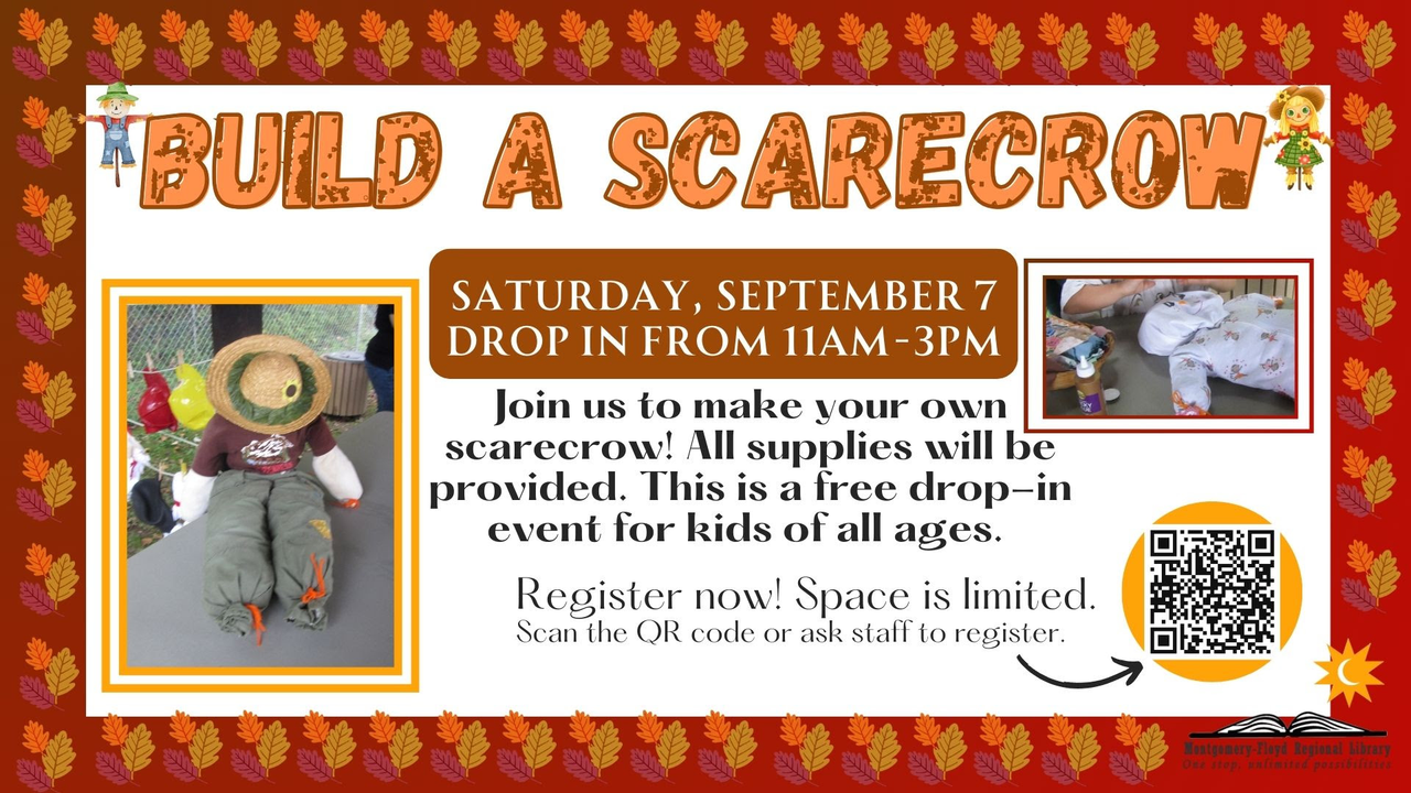 Join us to make your own scarecrow! All supplies will be provided. This is a free drop-in event for kids of all ages.