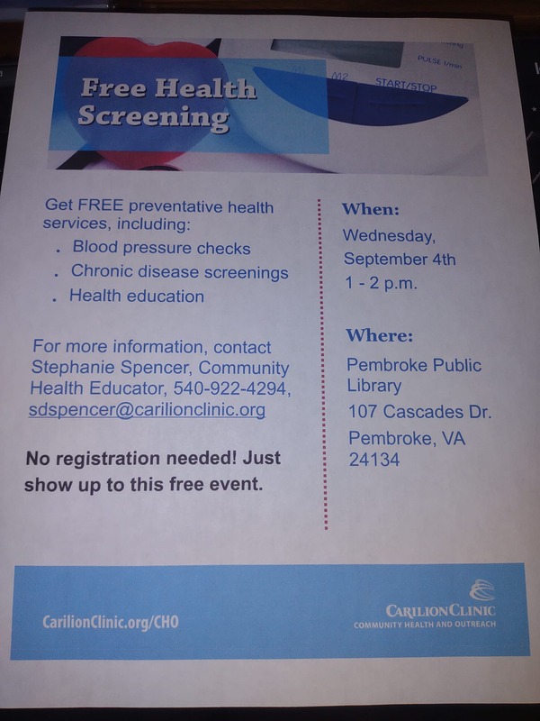 Pembroke Library and Carilion Clinic presents a Free Health Screening on Wednesday, September 4, 2024.