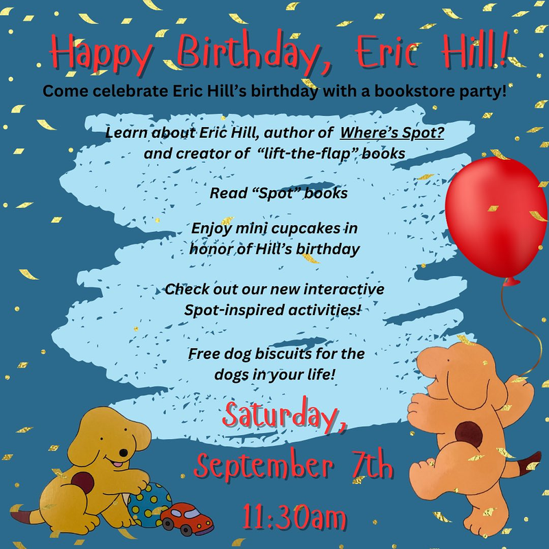Celebrate Eric Hill's birthday with a bookstore birthday party! Eric Hill is best known for his book, "Where's Spot", and all the companion "Spot" books. He created the lift-the-flap style books which are now featured in hundreds of books!