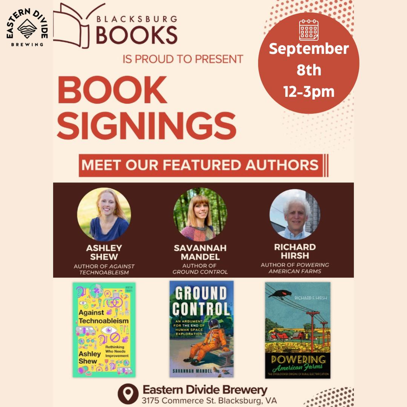 Eastern Divide Brewing and Blacksburg Books presents a Book Signing with Virginia Tech Authors Ashley Shew, Savannah Mandel and Richard Hirsh on Sunday, September 8, 2024.