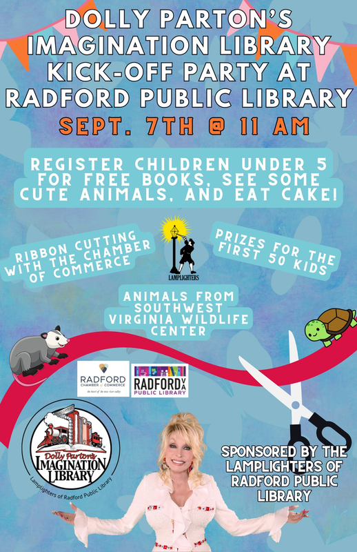 Join the library to register children under five for free books from Dolly Parton's Imagination library courtesy of the Lamplighters! There will be a ribbon cutting ceremony with the Radford Chamber of Commerce along with prizes for the first 50 kids attending. We'll also have cute animals visiting from Southwest Virginia Wildlife Center, and we'll celebrate it all with delicious cake!