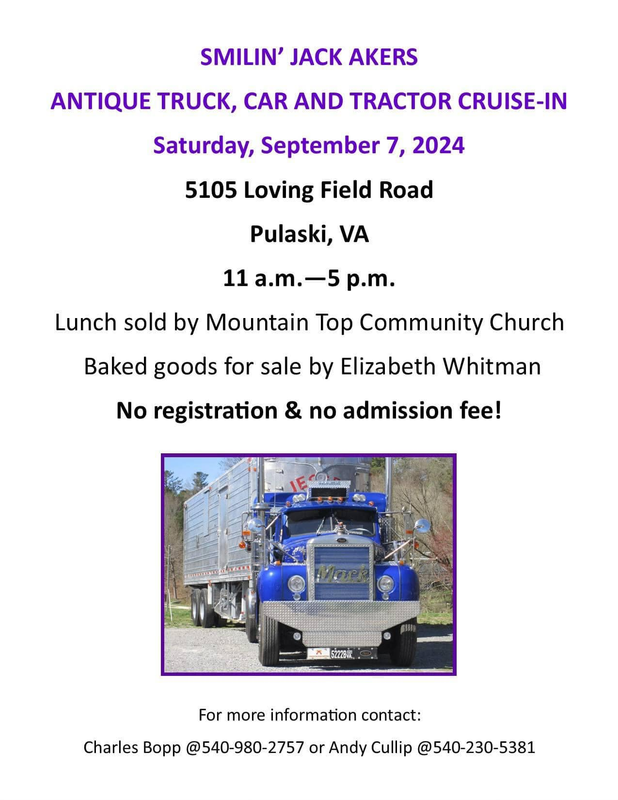 The Smilin' Jack Akers Antique Truck, Car and Tractor Cruise-In on Saturday, September 7, 2024 at Loving Field in Pulaski, VA.