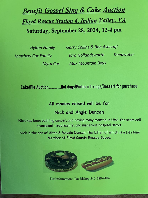 Indian Valley Rescue Squad Station 4 presents a Benefit Gospel Sing and Cake Auction for Duncan Family on Saturday, September 28, 2024.
