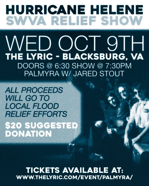 The Virginia Tech Center for Rural Education and The Lyric Theatre presents a Benefit Concert with Palmyra and The Jared Stout Band for Flood Relief Efforts on Wednesday, October 9, 2024 at The Lyric.