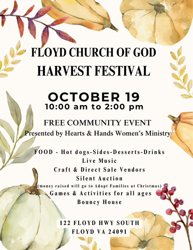 The Floyd Church of God Hearts & Hands Women's Ministry presents their annual Harvest Festival on Saturday, October 19, 2024.
