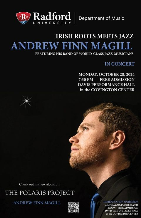 Radford University College of Visual & Performing Arts presents Irish Roots Meets Jazz with Andrew Finn Magill on Monday, October 28, 2024 inside Performance Hall located within the Covington Center on the campus of Radford University.