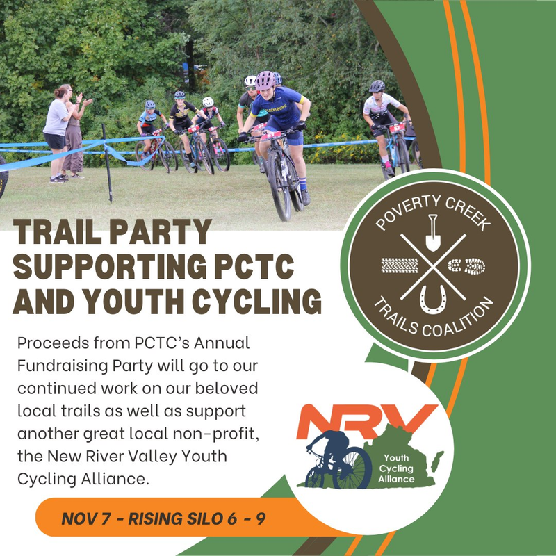 Join us for another awesome trail party! This annual Poverty Creek Trails Coalition Fundraiser will raise money to extend the Chimney Trail all the way to the Mountain Bike Skills park. This year marks the first time we have invited another local non-profit to help raise awareness and money for their cause, the New River Valley Youth Cycling Alliance (NRVYCA).