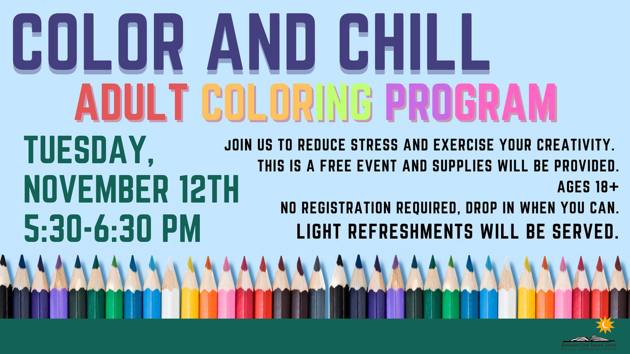 The Meadowbrook Public Library presents "Color And Chill" an adult coloring program on Tuesday, November 12, 2024.