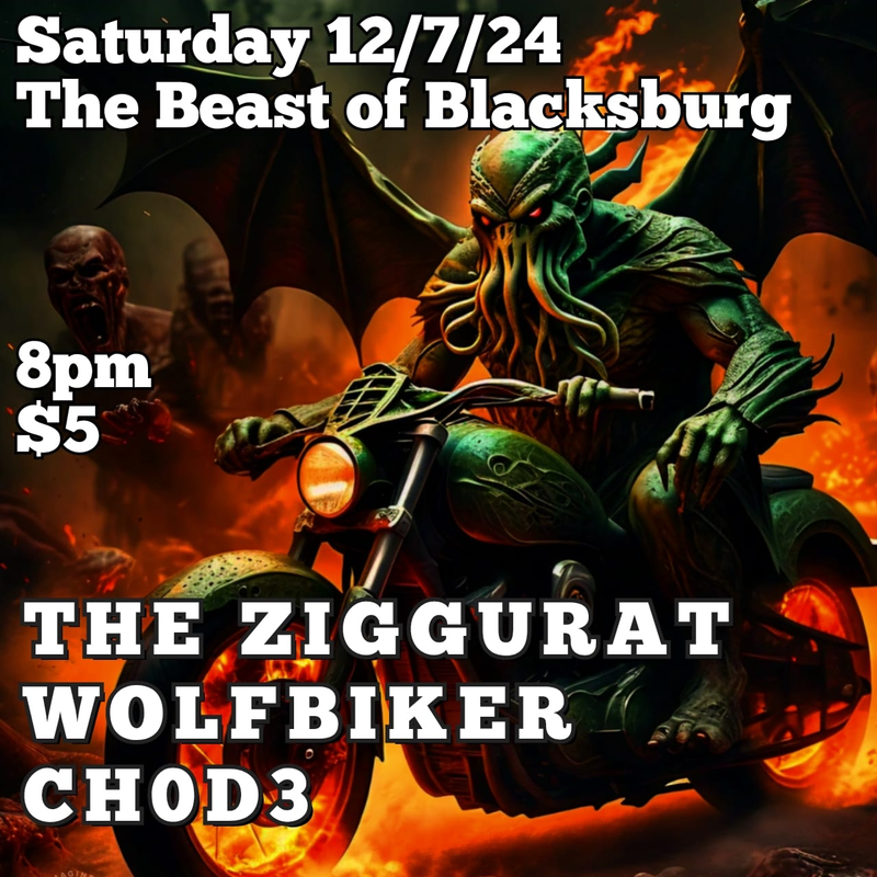 The Beast of Blacksburg Pizzeria & Bar presents The Ziggurat with special guests Wolfbiker and Chod3 on Saturday, December 7, 2024.