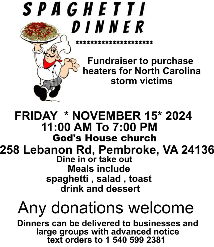 God's House Church hosts a Spaghetti Dinner Fundraiser to Purchase Heaters for North Carolina Storm Victims on Friday, November 15, 2024.