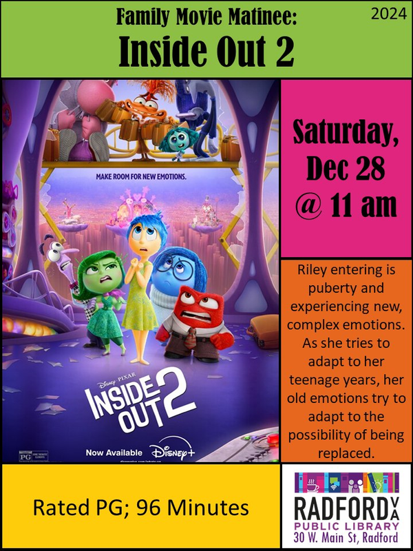 The Radford Public Library continues their Family Movie Matinee series featuring "Inside Out 2" on Saturday, December 28, 2024.