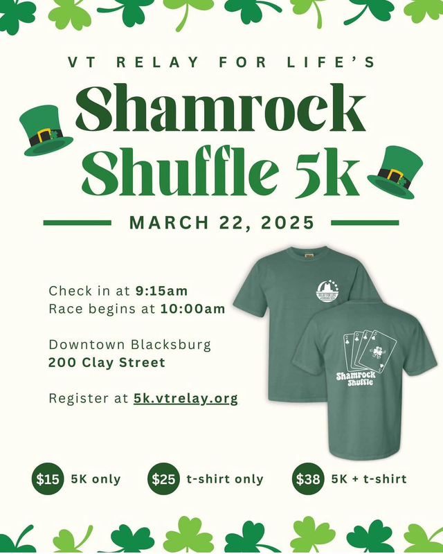 Relay For Life at Virginia Tech presents their 2nd Annual 5k Shamrock Shuffle on Saturday, March 22, 2025 starting and finishing at 200 Clay Street in downtown Blacksburg, VA.
