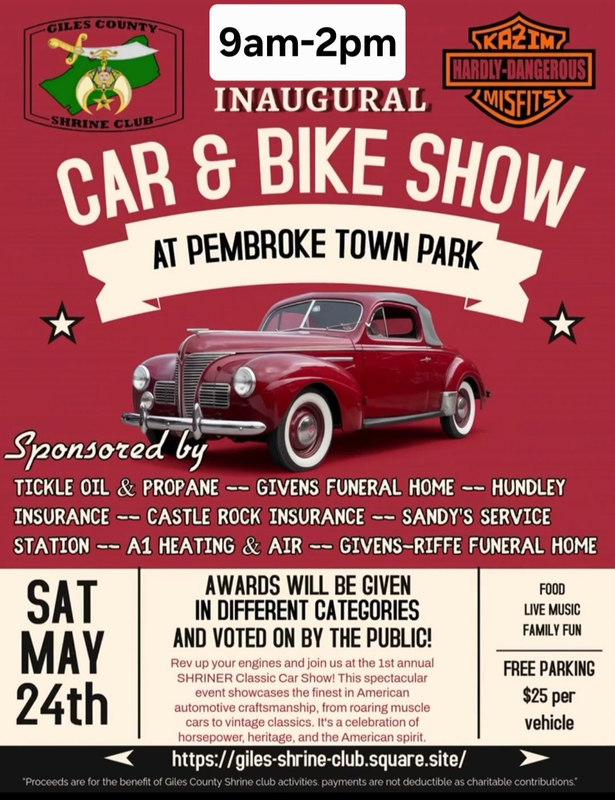 The Giles Shrine Club and Kazim Misfits presents the Inaugural Shriner Classic Car & Bike Show on Saturday, May 24, 2025 at the Pembroke Town Park.