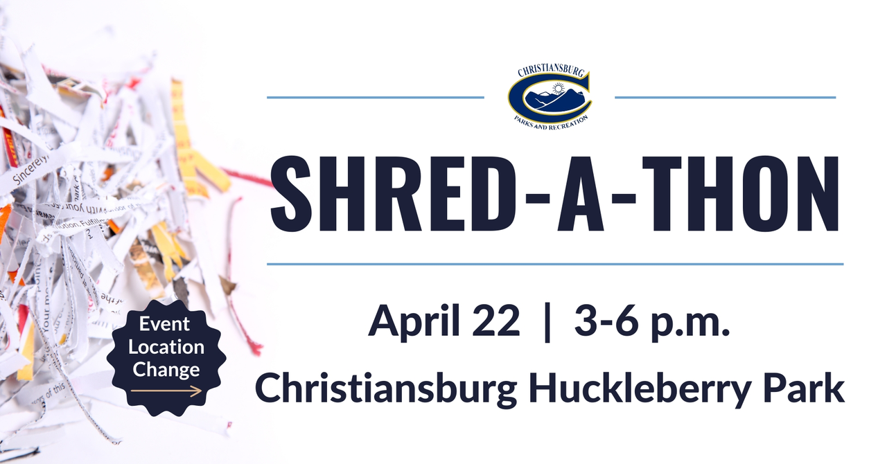 Christiansburg Department of Parks and Recreation presents the 2025 Spring Drive-Through Shred-A-Thon on Tuesday, April 22, 2025 in the parking lot of the Christiansburg Huckleberry Park.