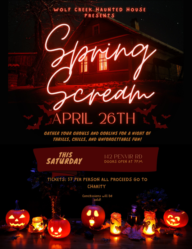 Wolf Creek Haunted House presents the Spring Scream Haunted House on Saturday, April 26, 2025 at the Wolf Creek Ruritan Grounds.