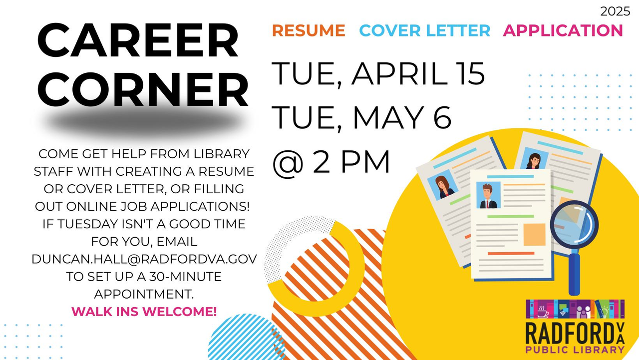 The Radford Public Library presents a Career Corner event on Tuesday, May 6, 2025.