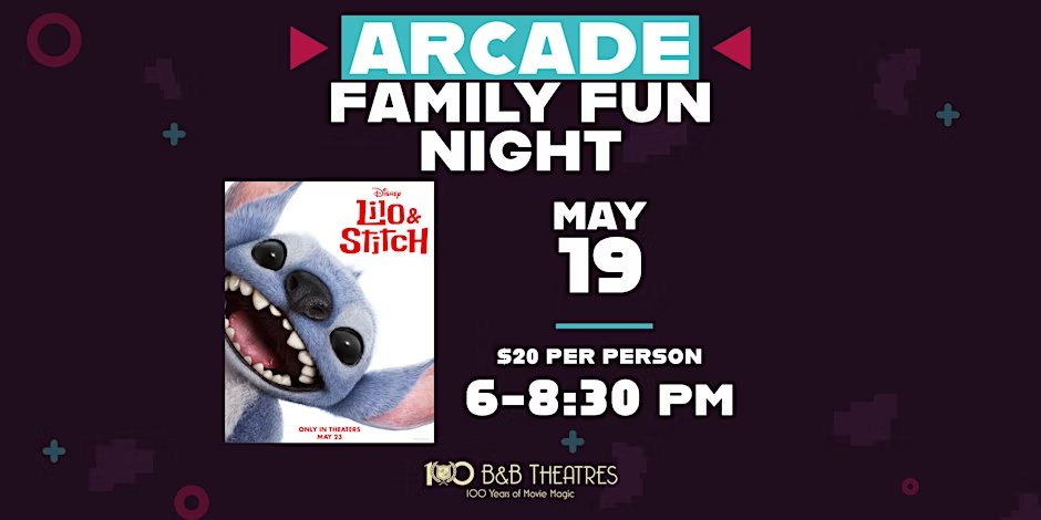 Join us at B&B Theatres/McClains for Arcade Family Fun Night in celebration of Lilo & Stitch releasing very soon!