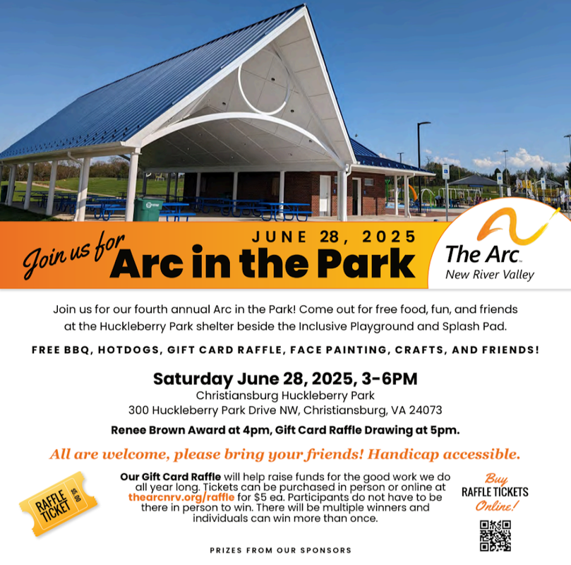 The Arc of the New River Valley presents the 4th Annual Arc in the Park on Saturday, June 28, 2025 at Shelter #1 at Christiansburg Huckleberry Park.