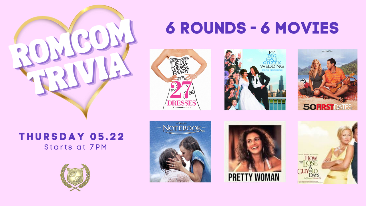 There will be six rounds of trivia concentrating on six rom-coms including 27 Dresses, My Big Fat Greek Wedding, 50 First Dates, The Notebook, Pretty Woman and How To Lose A Guy In 10 Days.