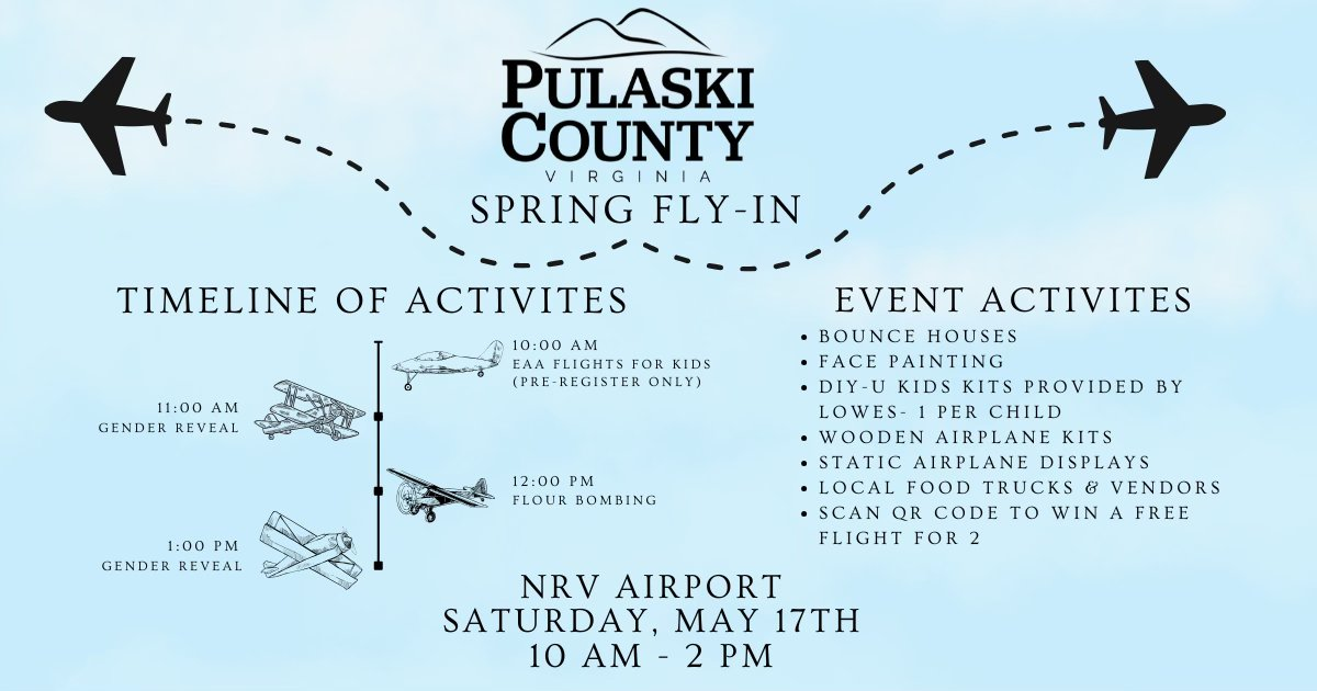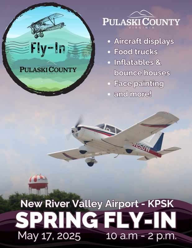 The New River Valley Airport Commission, in partnership with Pulaski County Tourism, Foster Aviation and Mobile Maintenance, New Tech Aviation, Upward Aviation, will be hosting the Spring 2025 Fly-In on Saturday, May 17, 2025.