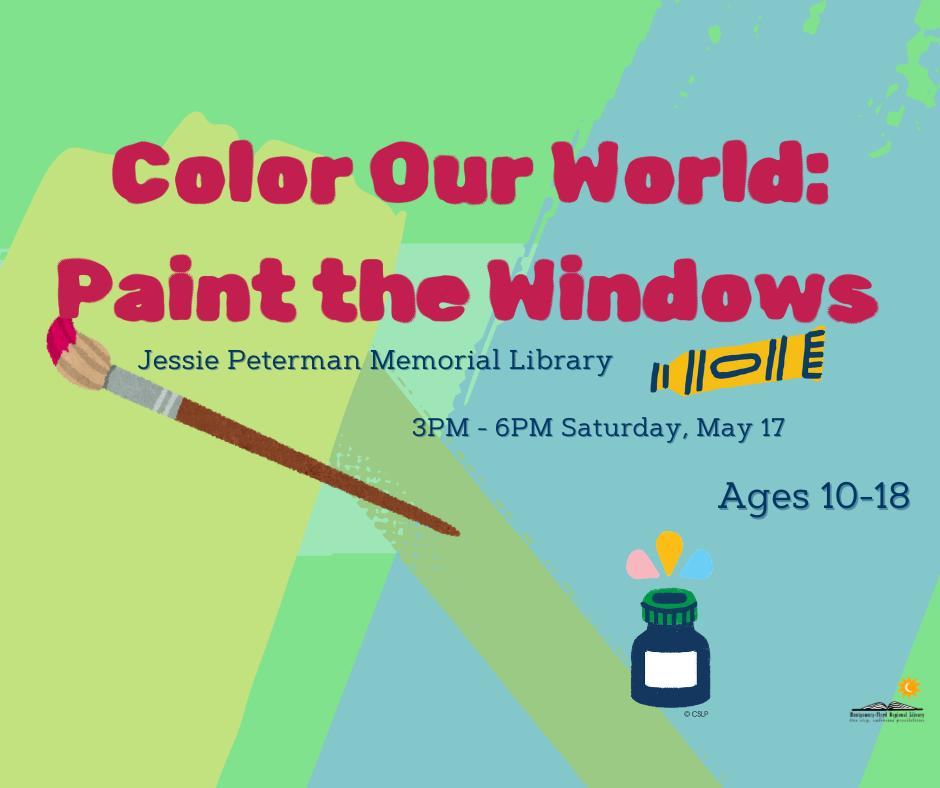 The Jessie Peterman Library presents Color Our World: Paint the Windows on Saturday, May 17, 2025.