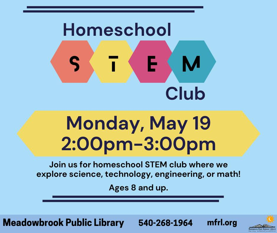 The Meadowbrook Public Library presents their Monthly Homeschool STEM Club on Monday, May 19, 2025.