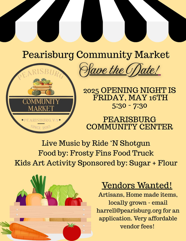 Join in the fun this Friday evening at the Pearisburg Community Market opening night! Bring a chair and enjoy live music by Ride'n Shotgun Band, grab a bite to eat from Frosty Fins food truck, shop with our unique vendors and enjoy a kids art activity sponsored by Sugar + Flour.