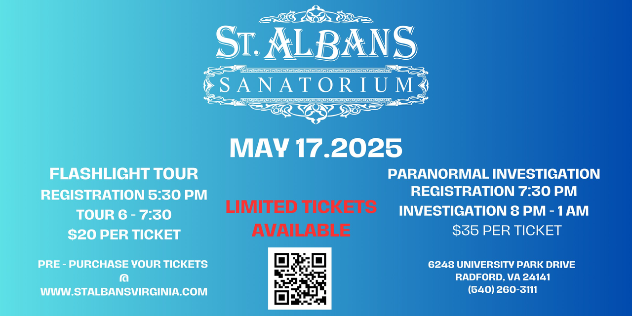 Join us for our May Flashlight Tour which includes a little history and paranormal in one. This is a guided tour and your tour guide will go over paranormal experiences from within the building. Take a walk through the dark halls of St. Albans Sanatorium and join us for a flashlight tour of our building. Hear all the chilling tales of what paranormal investigators, and the public, have encountered within these 120 year old walls. A little bit of history, a little bit of paranormal.