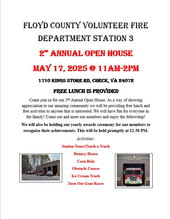 Floyd County Volunteer Fire Department Station #3 presents their 2nd Annual Open House on Saturday, May 17, 2025.