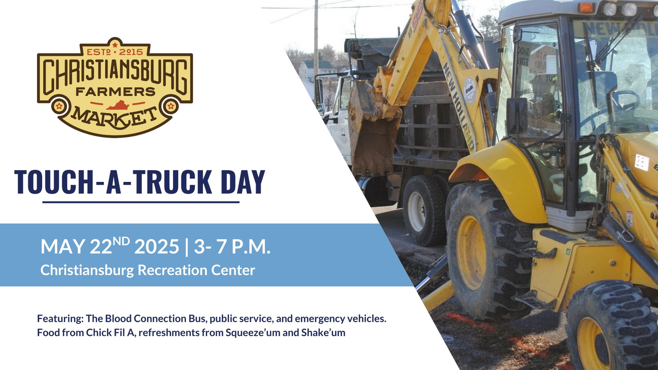 The Christiansburg Farmers Market presents their Touch-A-Truck Day on Thursday, May 22, 2025 in the back parking lot of the Christiansburg Recreation Center.